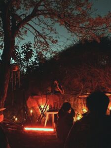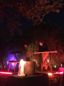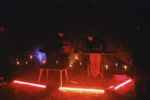 A medida que el show comenzó a trasladarse de lo botánico a lo netamente maquinal, dejando las sonoridades líquidas para adentrarse en texturas más rugosas, el calor (literal) del ambiente aumentó. A alguien se le había ocurrido prender un canasto de mimbre en un brasero y ese fuego funcionó como acompañante de la música crepitante ejecutada por el dúo en los teclados. La cosa ya se había vuelto una performance a esta altura de la noche. O para ser más preciso, un rito, que concluyó con un pasaje de percusiones y zumbidos que cerraron el círculo perfecto.